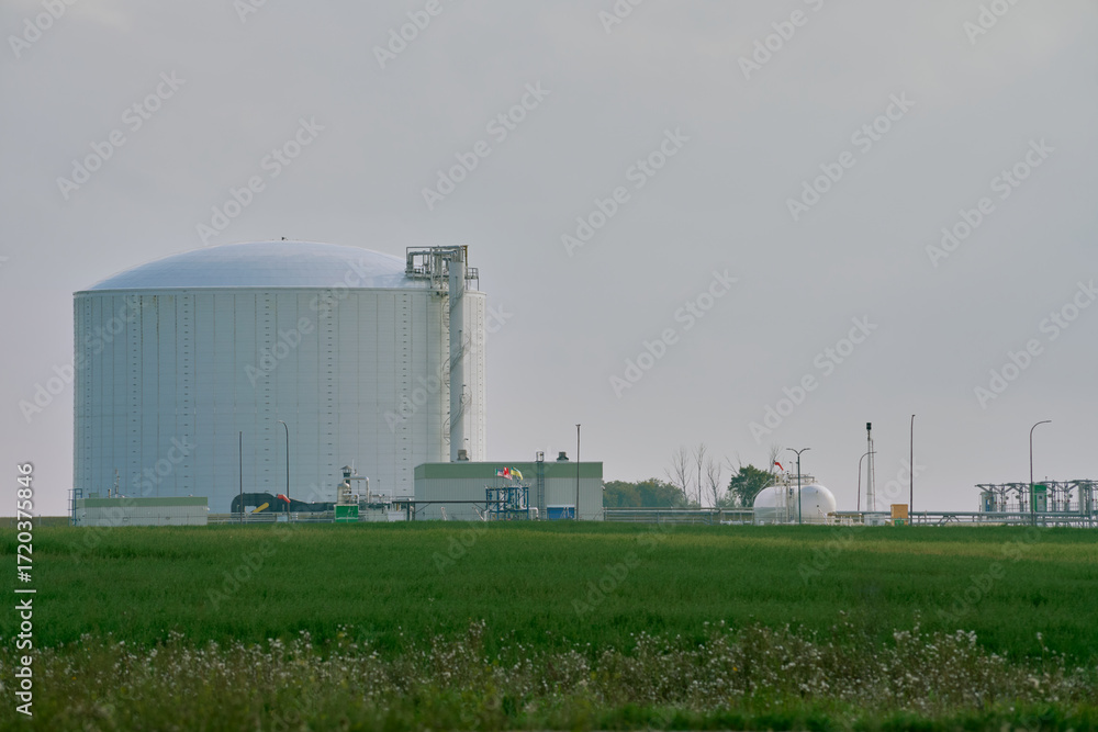 Massive white industrial storage tank in Saskatchewan, Canada, surrounded by pipelines and auxiliary facilities under cloudy sky, representing energy and chemical storage infrastructure.