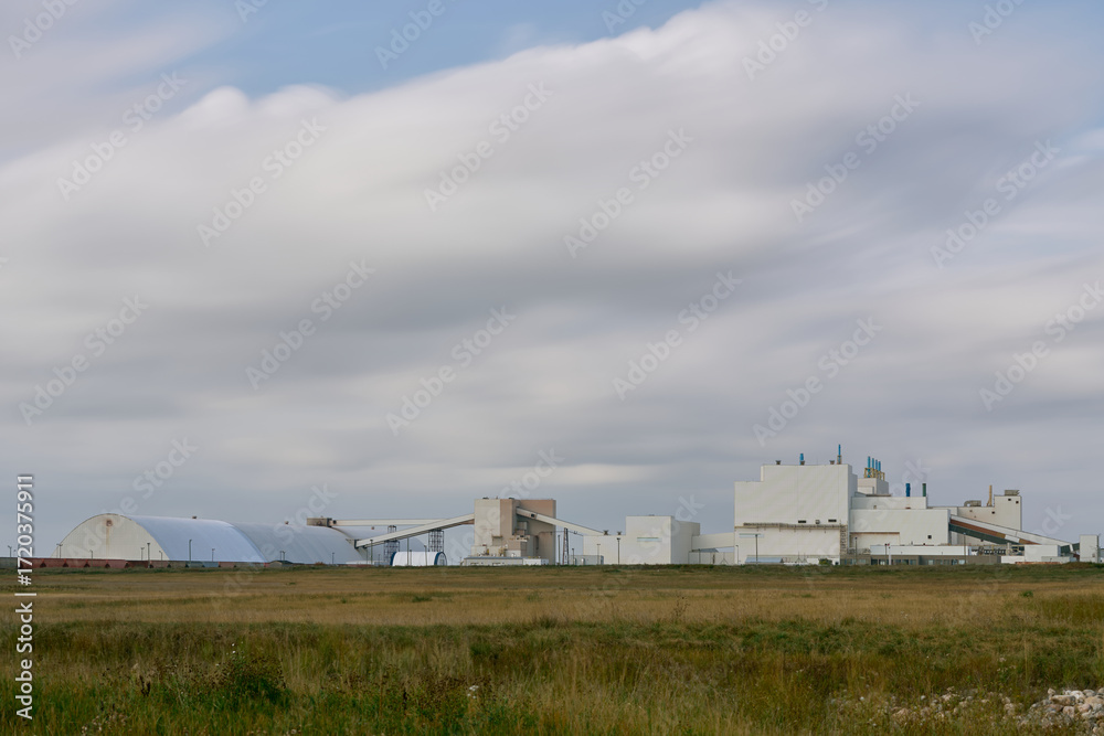 Modern industrial mining facility in Saskatchewan, Canada, featuring white factory buildings, conveyor systems, and a tall shaft tower against a cloudy sky with grassy foreground.