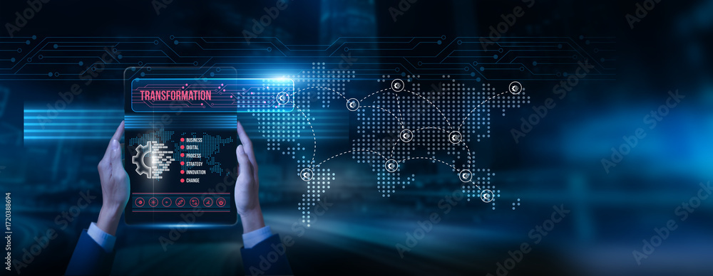 Transformation consultant holding a tablet with transformation data on screen innovation strategy digital growth process improvement global connectivity seamless integration future vision, and success