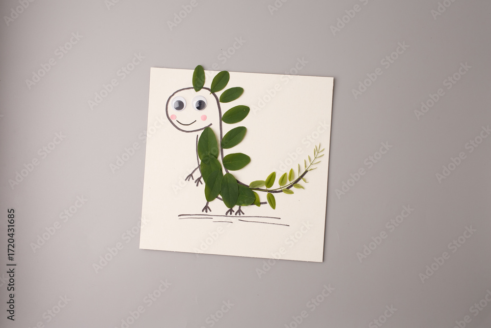Eco dinosaur collage made with leaves and drawn lines for creative kids projects, perfect for stationery brands, children product packaging, art teachers, early education content marketing