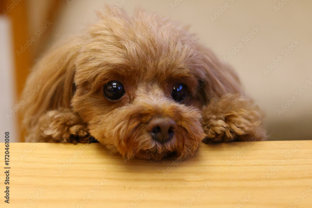 テーブルの上に顔を出して何かを訴えているトイ・プードル