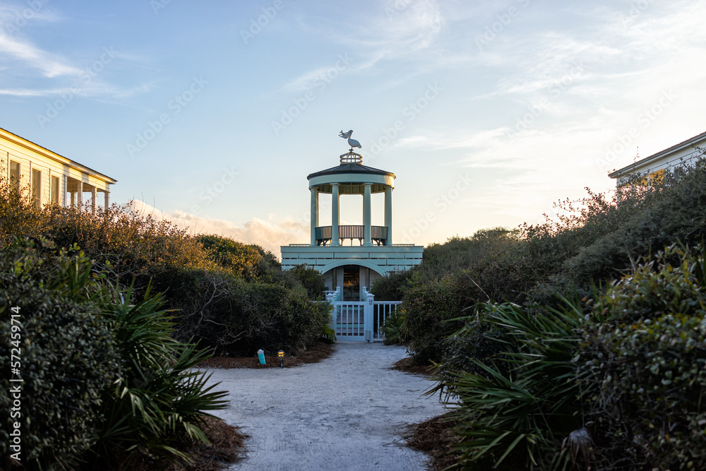 Torre histórica de piedra que se alza en el centro de una plaza al anochecer. El cielo es de un intenso índigo y azul noche, con nubes que aparecen largas y veteadas