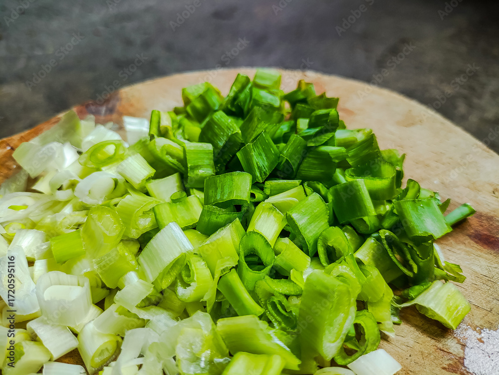 Vibrant green and white scallions neatly prepared, highlighting fresh ingredients for cooking