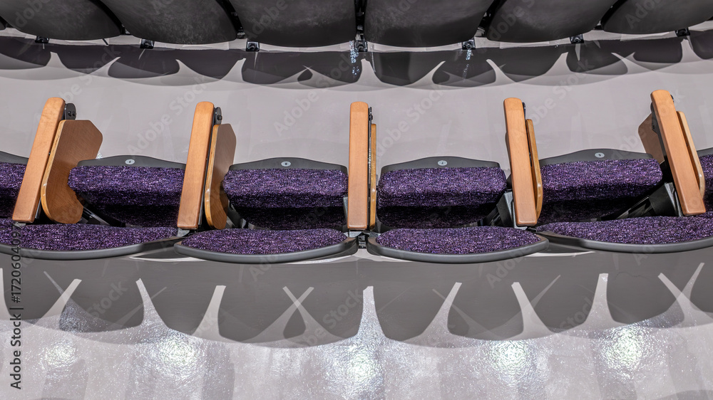 Purple padded auditorium seats, chairs with gray concrete floor, in an empty assembly, classroom, theatre space looking down from a drones perspective.