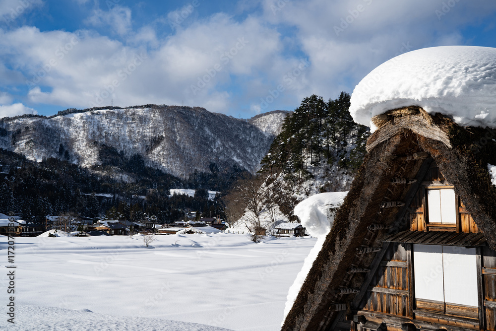 Snow-covered triangular house partially visible in the corner at Shirakawa-go