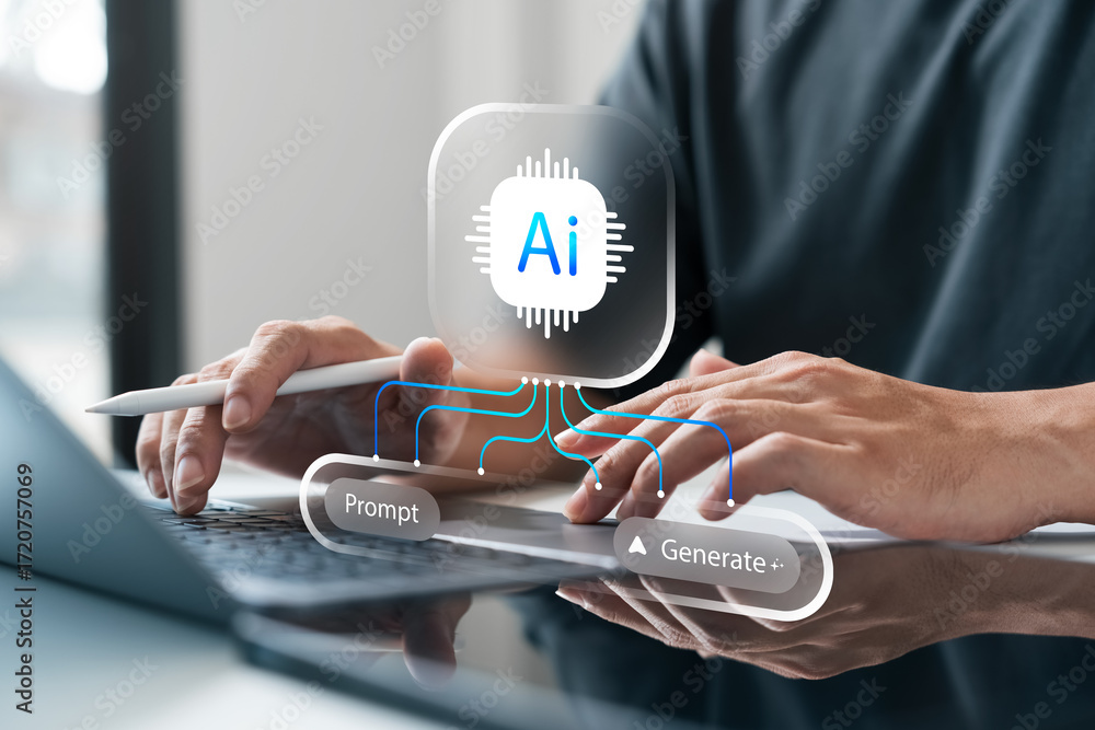 The concept of generative AI technology creating content from user prompts using advanced algorithms. Man interacting with laptop and tablet to generate digital output efficiently.