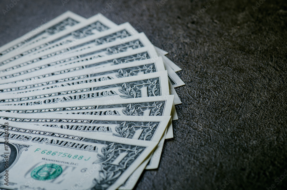 One dollar banknotes on a black table. Cash money american dollars. Vintage background. Lens flare. American currency.