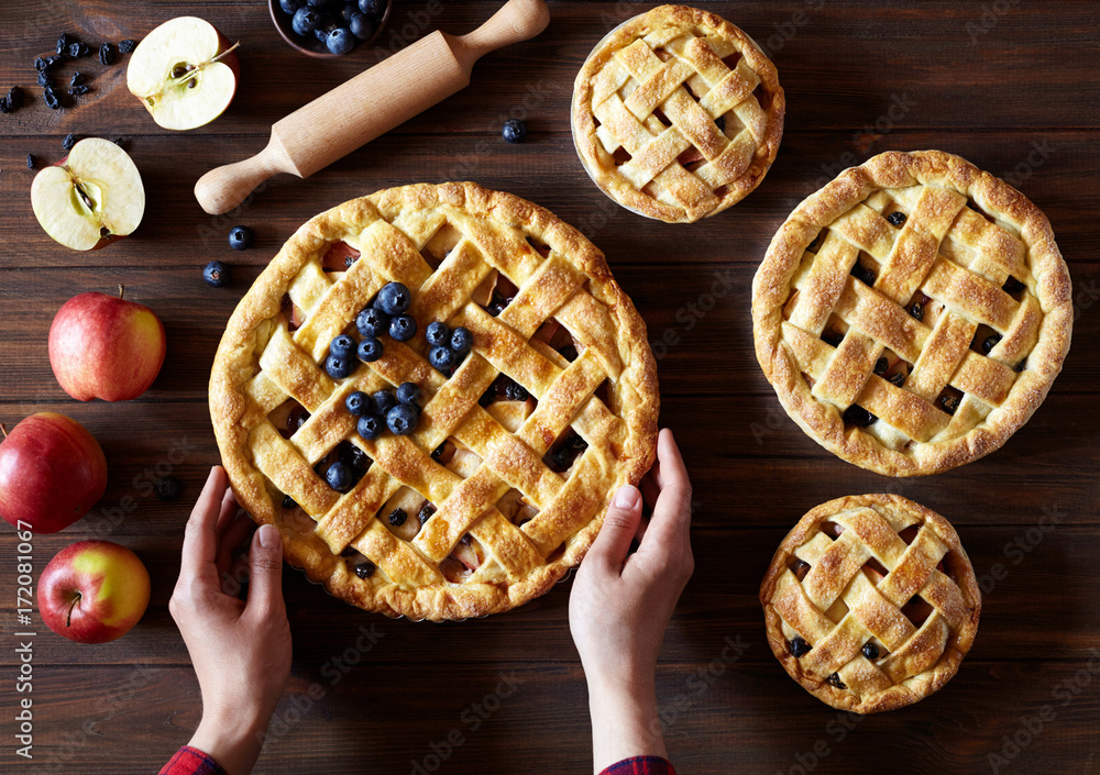 Apple pie on the wooden table with apples, raisins, blueberry and rolling pin. Hands in the frame. Traditional dessert for Thanksgiving. Flat lay bakery food background. Dark food photo.