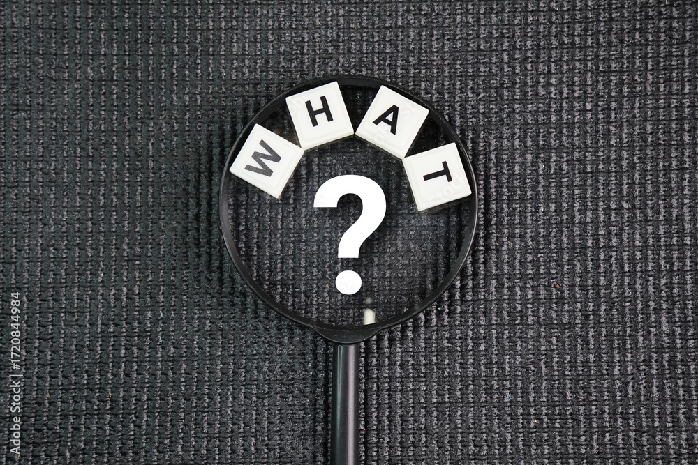 Magnifying glass and icon with the question mark word what? asking for information specifying something.