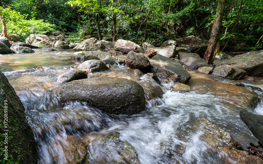 A clear forest stream with small waterfalls cascades over moss-covered rocks within the serene and lush Ban Bon Khuan Community Forest in Songkhla, Thailand.