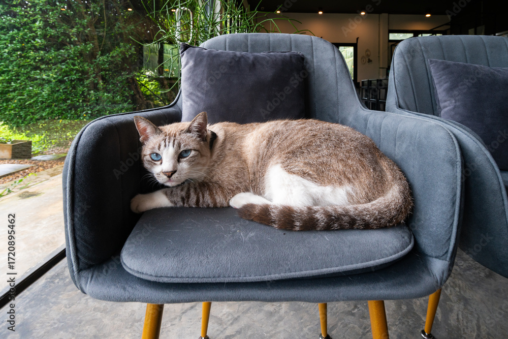 A striped tabby cat with stunning blue eyes is seen curled up comfortably on a plush gray armchair, basking in the natural light that filters in from a large window.
