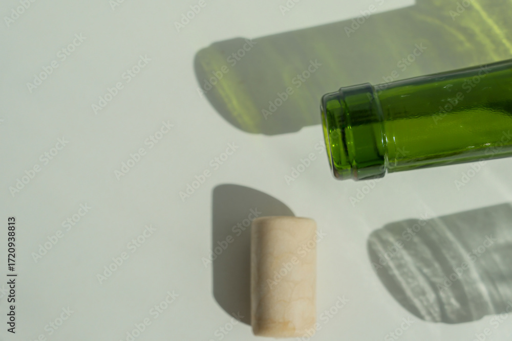 The neck of a green glass bottle and a synthetic cork. Deep shadows on a white background. Shallow depth of field. Minimalism. Copy space.