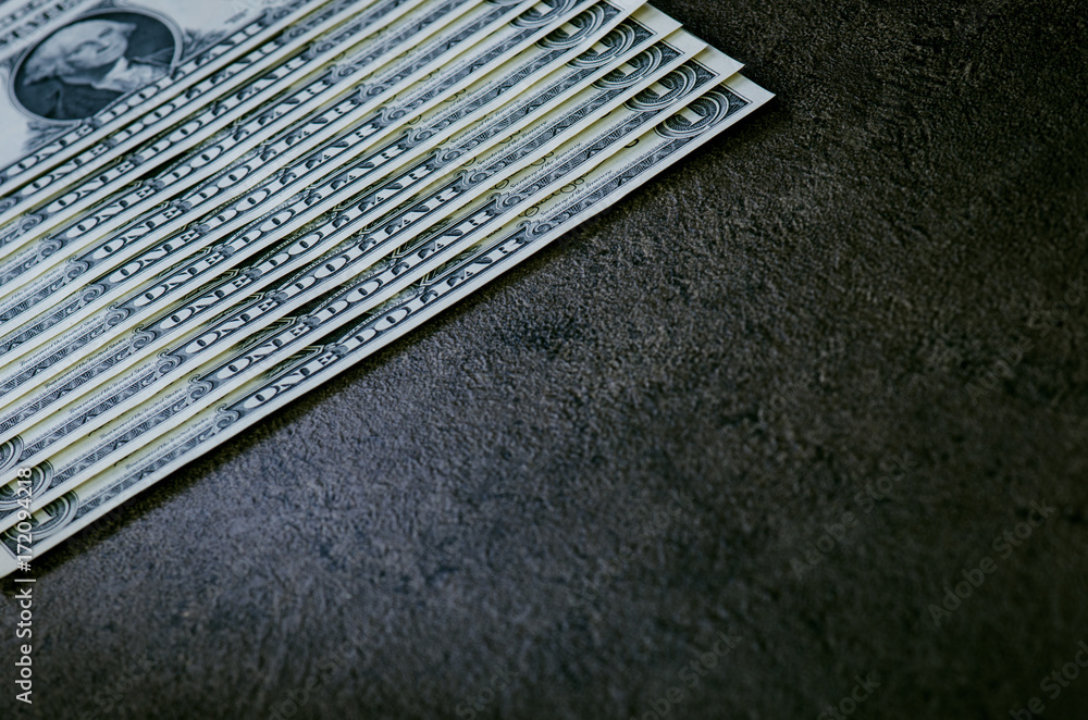 One dollar banknotes on a black table. Cash money american dollars. Vintage background. Lens flare. American currency.