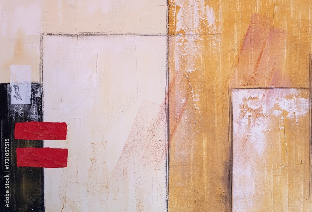 Abstract textured brushstrokes. Geometric blocks of beige, ocher, black, and red. A contemporary artistic composition with rectangles and lines, minimalist wall decor, and textured acrylic painting.