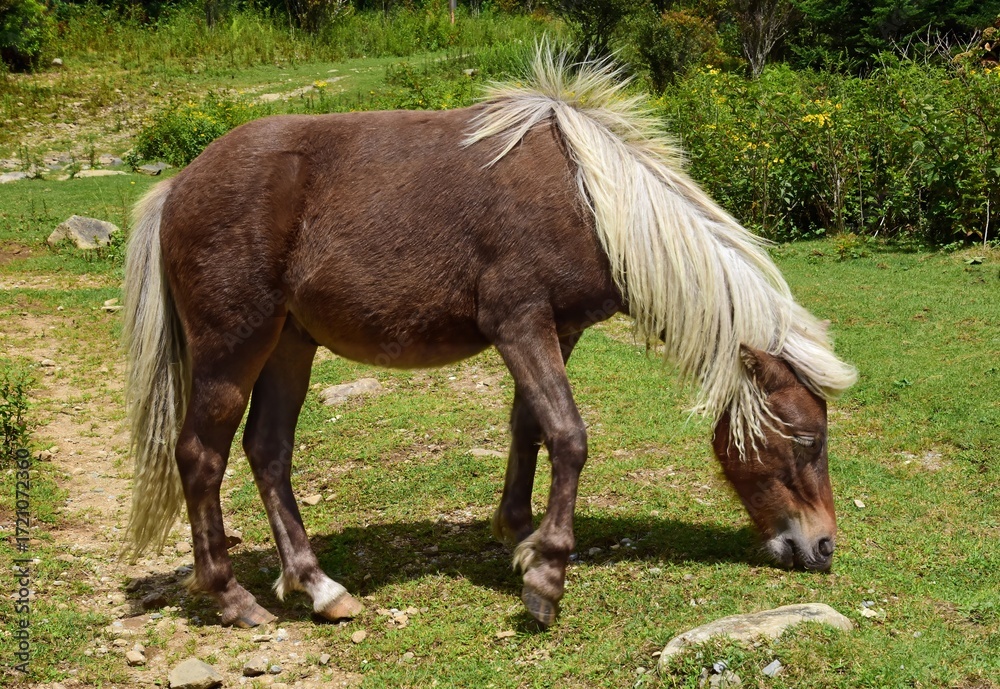 a flaxen chestnut feral pony along the hiking trail in summer to wilburn ridge in grayson highlands state park in southwestern virginia