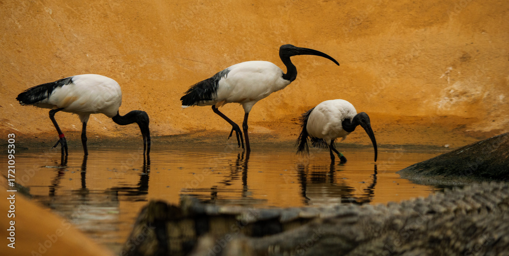 Trois Threskiornis aethiopicus, aussi appelé Ibis sacré, les pied dans l'eau