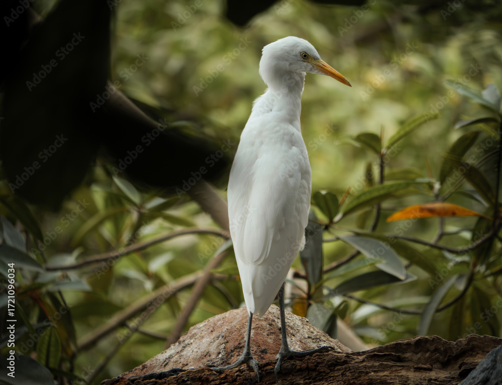 Héron garde-bœuf derrière les feuilles