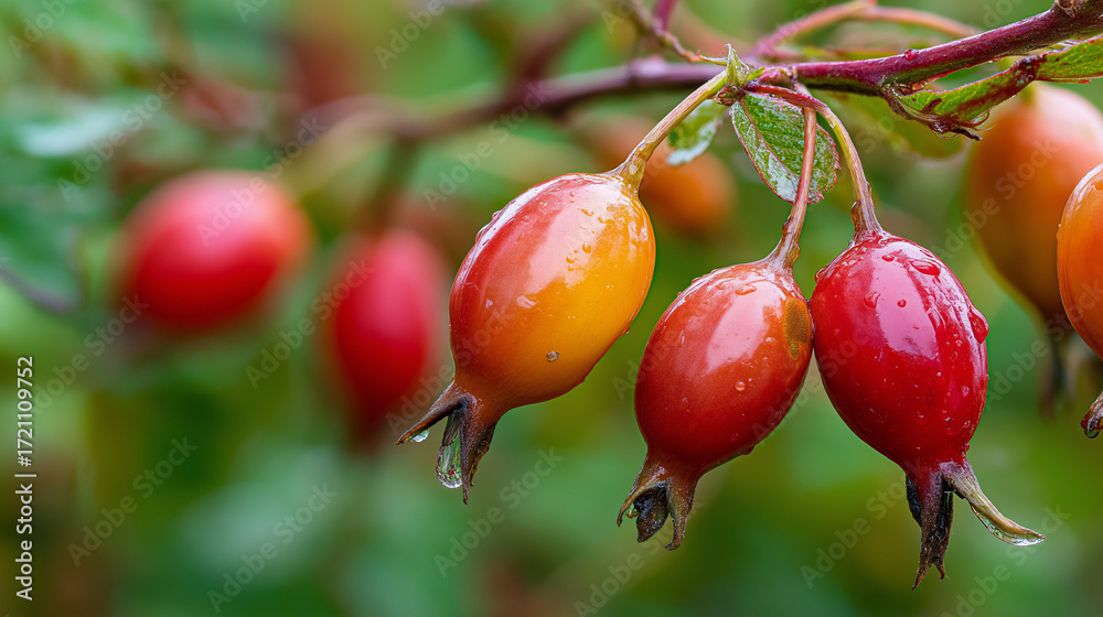 Close-up of ripe, bright rose hips. Symbolizes growing natural vitamins for cold prevention, natural nutrition. Ideal health content, wellness campaigns.