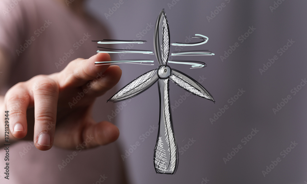 Sketch of wind turbine, hand interacting, clean energy, eco-friendly concept. Ideal for presentations or websites.