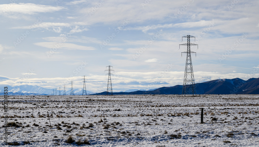 Power pylon and power lines on snow-covered field in winter. Twizel. South Island. New Zealand.
