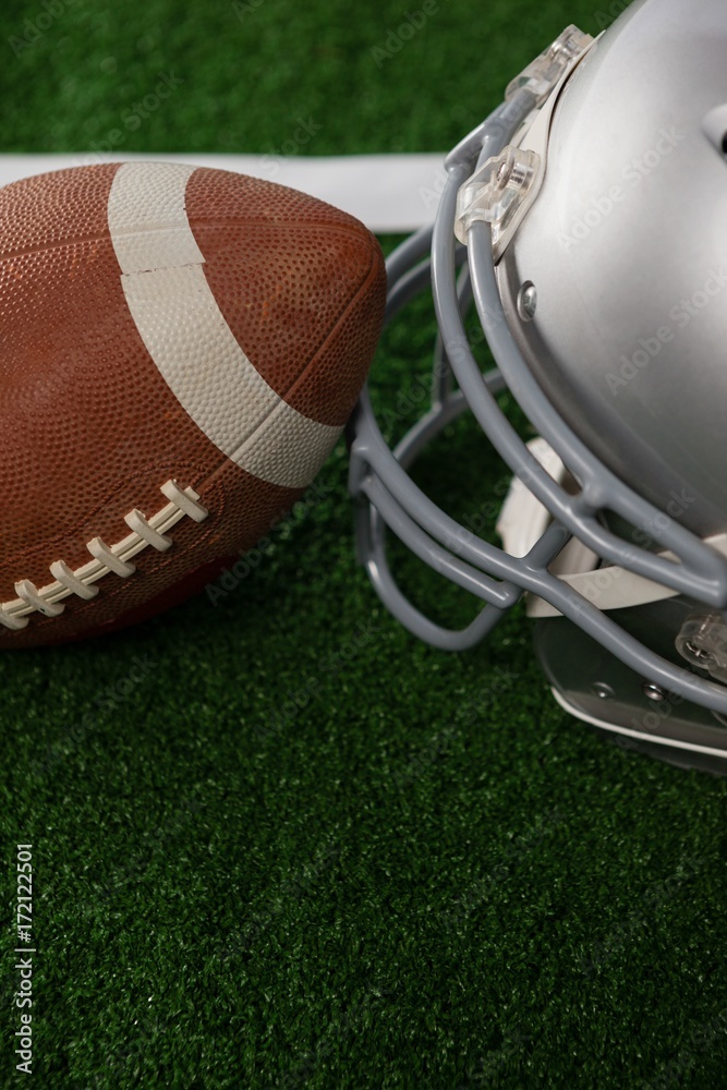 High angle view of American football by sports helmet
