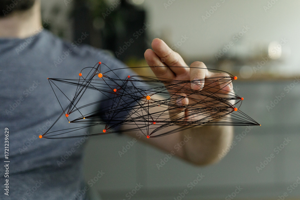 Abstract image of a hand interacting with a complex network, representing connection, technology, and data flow.