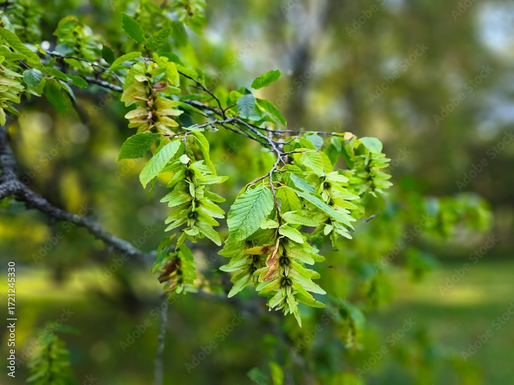 Close-up of common hornbeam (Carpinus betulus) branch with fresh green seed clusters and leaves, natural forest detail in soft sunlight.