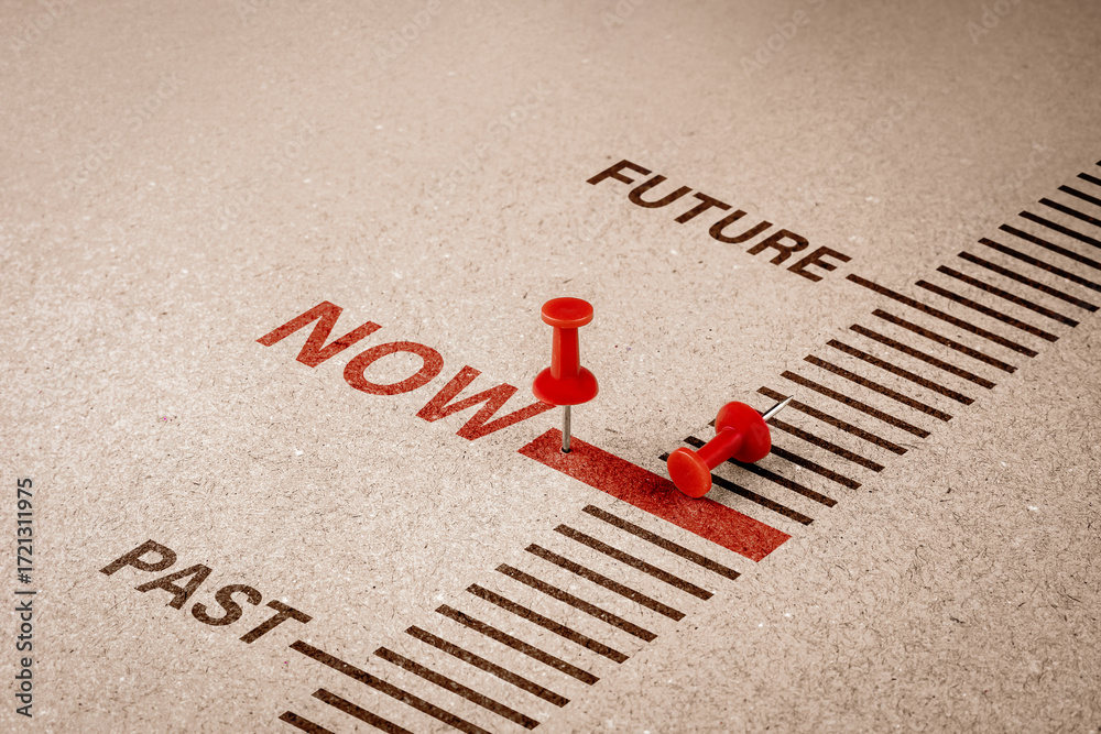 Red pin mark on paper background to highlight the word Now. Concept for focusing on current affairs, business trends, and popular technology.
