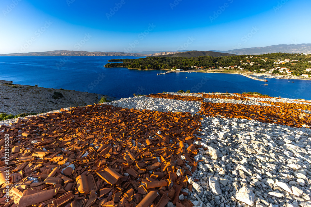 Rab the hill above the port in Lopar, the Croatian flag placed on a slope of red roof tiles,