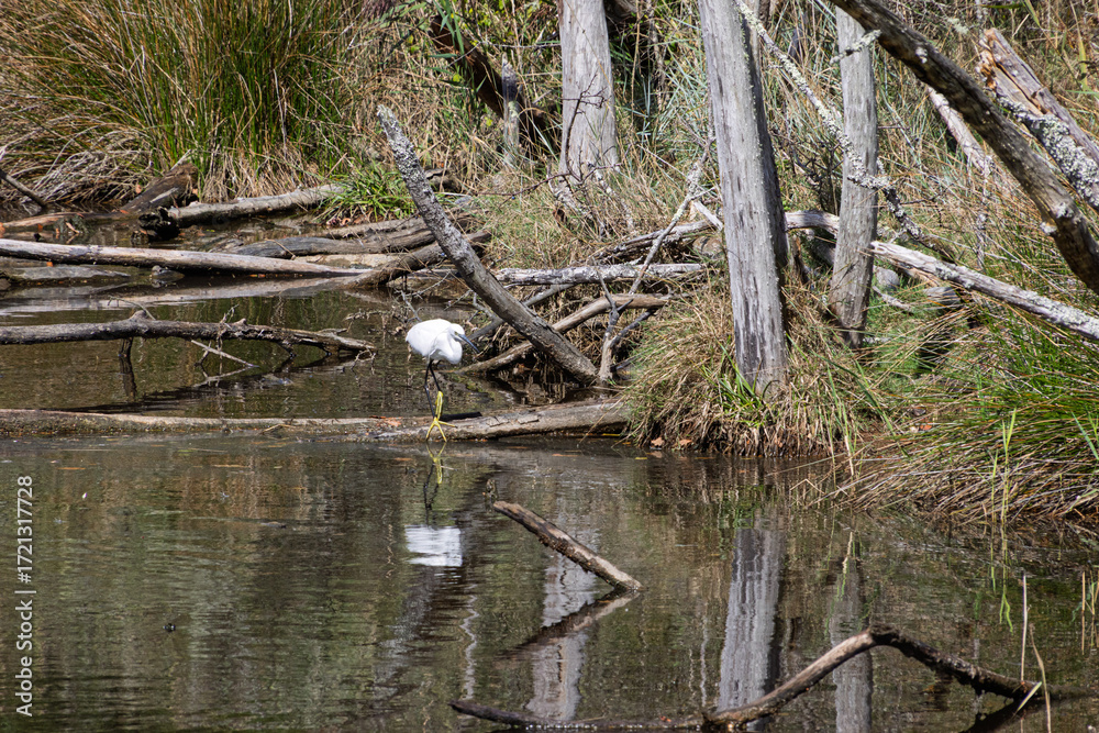 Seidenreiher (Egretta garzetta) in einem Gewässer beim Fischfang