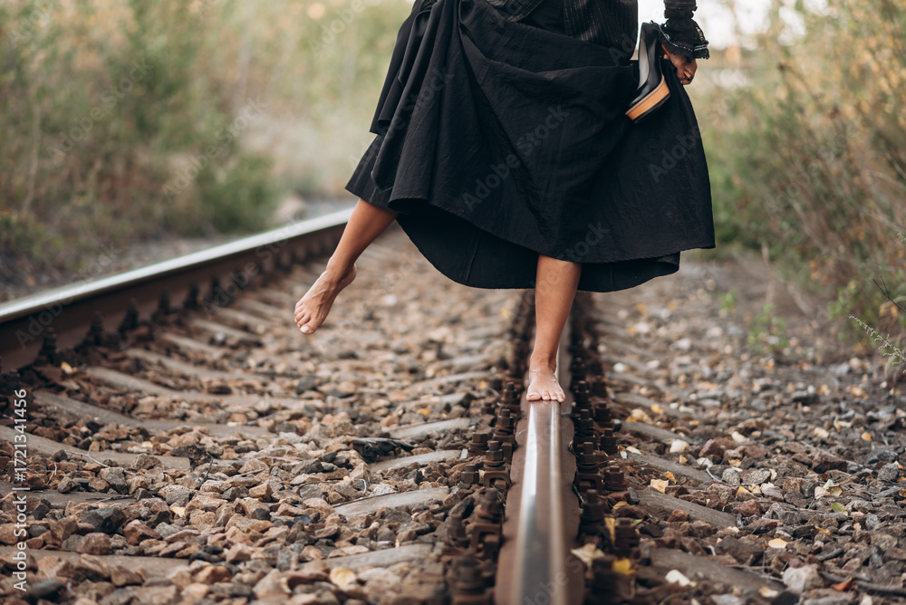 Barefoot Woman Balances on Railway Track in Black Dress