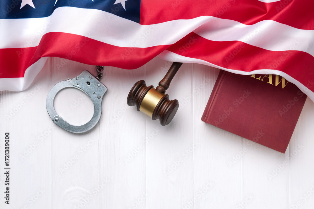 Judge's gavel, handcuffs and law book with American flag on a white wooden desk.