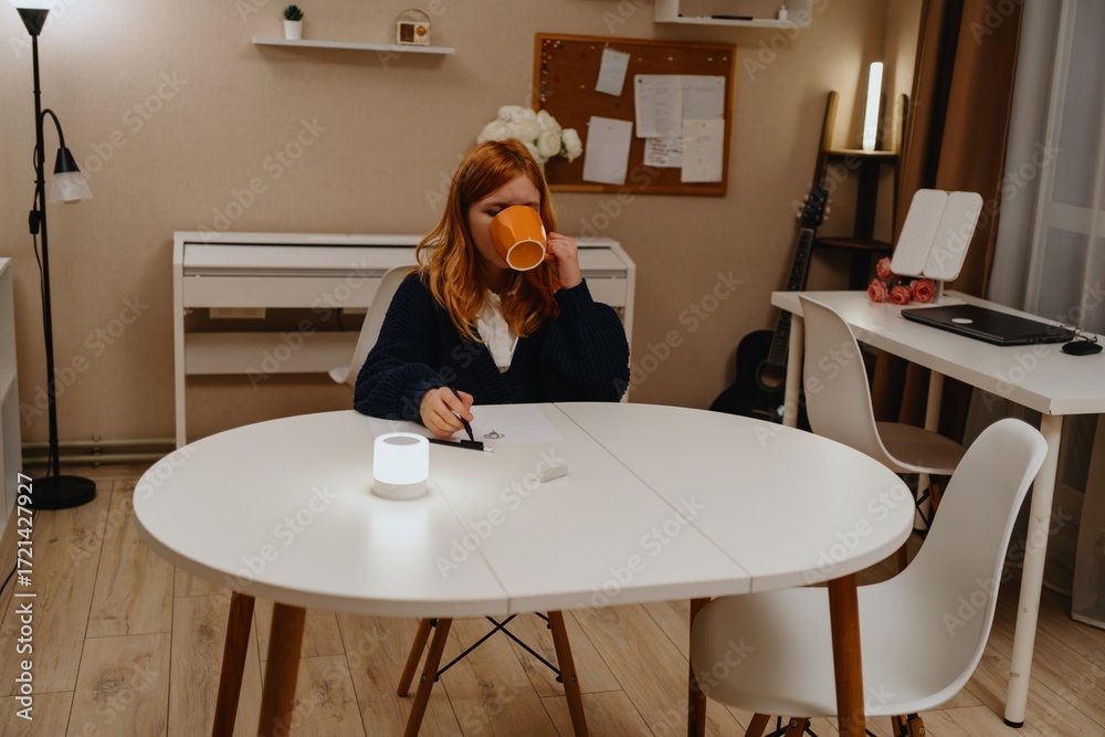 A teenage girl studies in the living room during evening hours, drinking coffee while focusing on homework. Captures authentic student life and modern study routines