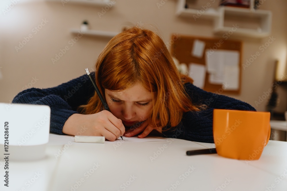A teenage girl studies in the living room during evening hours, drinking coffee while focusing on homework. Captures authentic student life and modern study routines