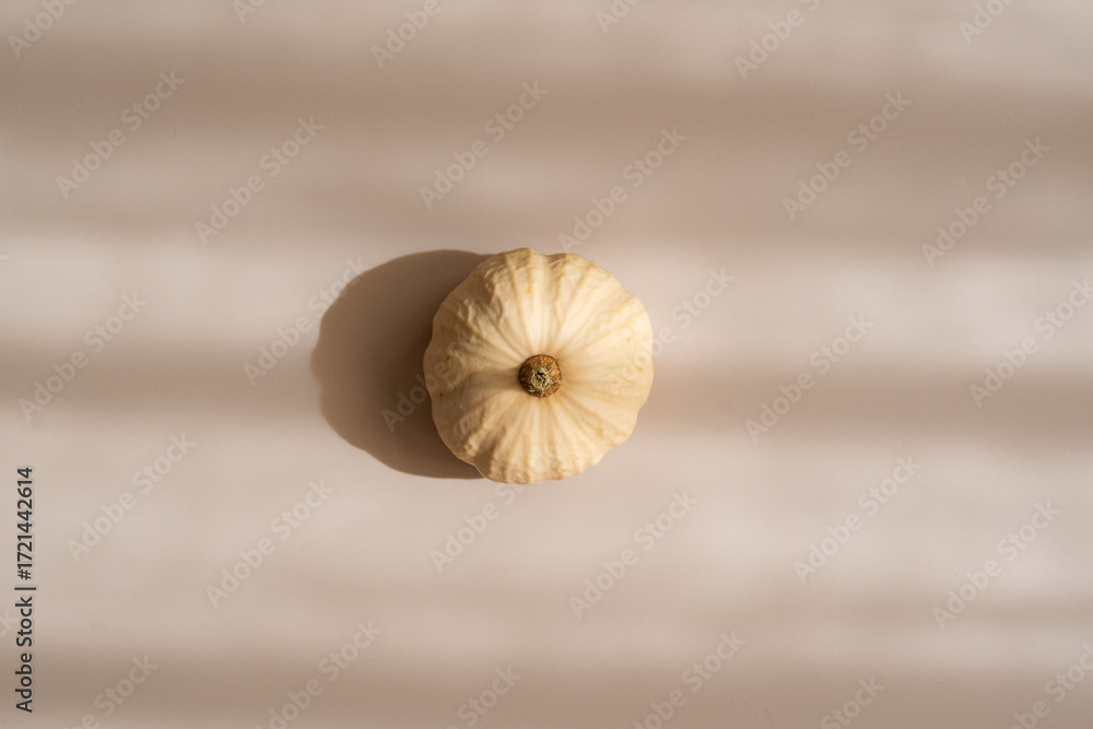 Small decorative pumpkin on beige background, soft shadows, minimal top view aesthetic