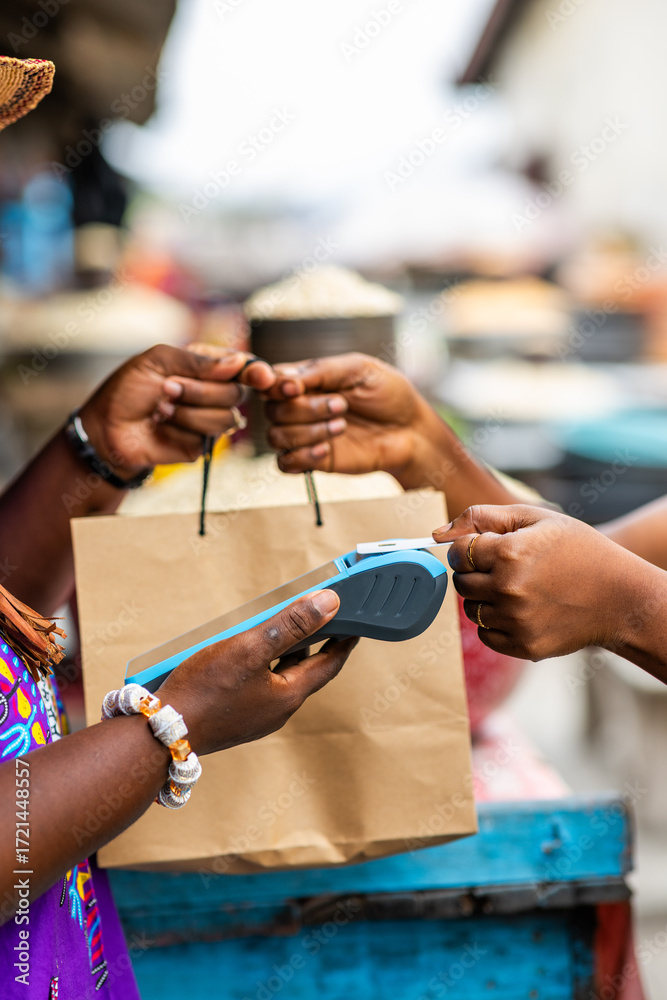 Contactless payment in Africa. A customer makes a successful transaction via mobile point of sale, POS terminal at an outdoor local traditional market.
