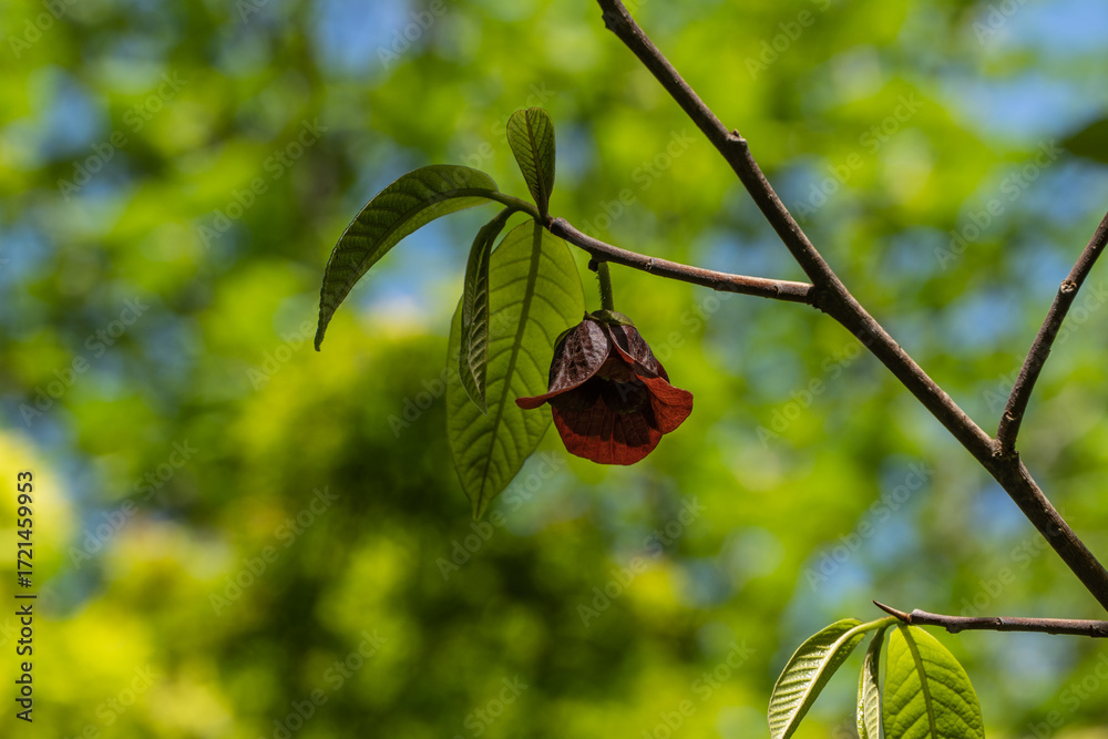 Close-up of purple flowers on branch of Asimina triloba or papaya in spring garden on green blurred background. Spring concept. Selective focus. There is space for text.