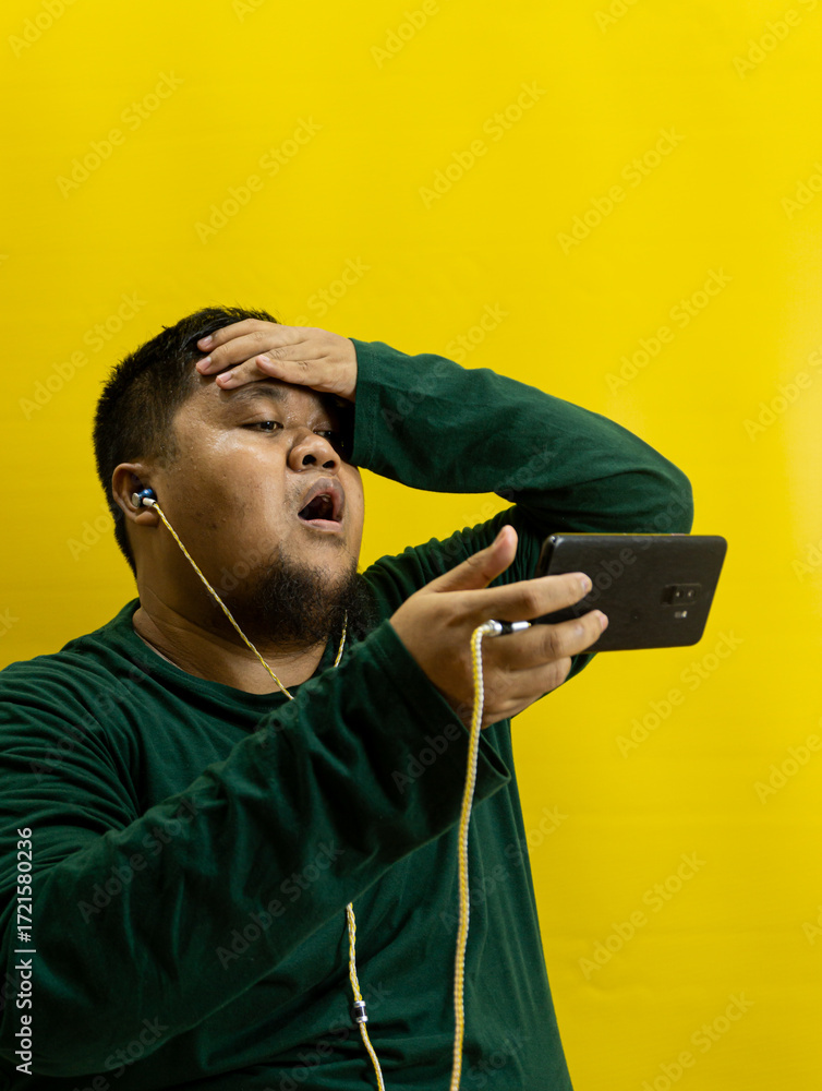 Man in green shirt with wired earphones watching smartphone with frustrated expression, hand on forehead, isolated on yellow background, stress or disappointment.