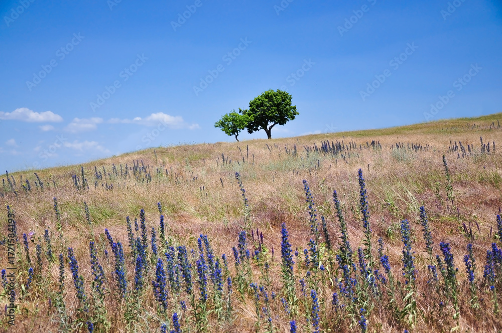 Peaceful rural scene of a golden field covered with purple blossoms and a single tree on the horizon against a bright blue sky captures the calm beauty of warm summer days