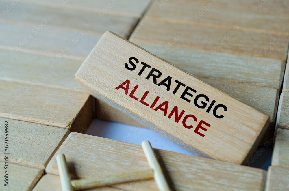 Strategic alliance text written on wooden blocks symbolizing powerful partnerships and strategic connections.