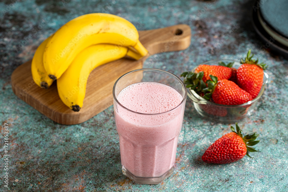 Strawberry, banana, and milk smoothie. Strawberry and banana vitamin.