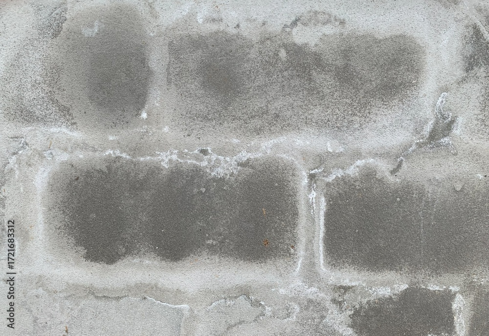 A close-up texture shot of an old, weathered gray concrete block wall showing signs of wear and water damage.