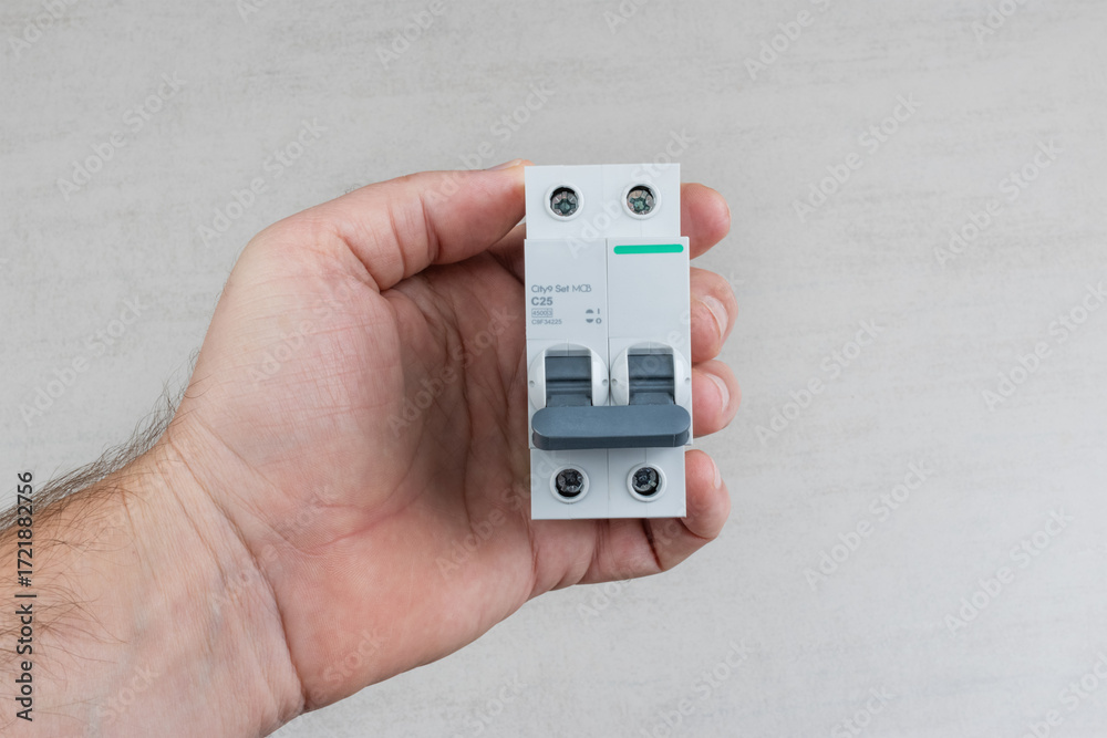 The man holds in his hand of new automatic electrical switch on a gray background top view