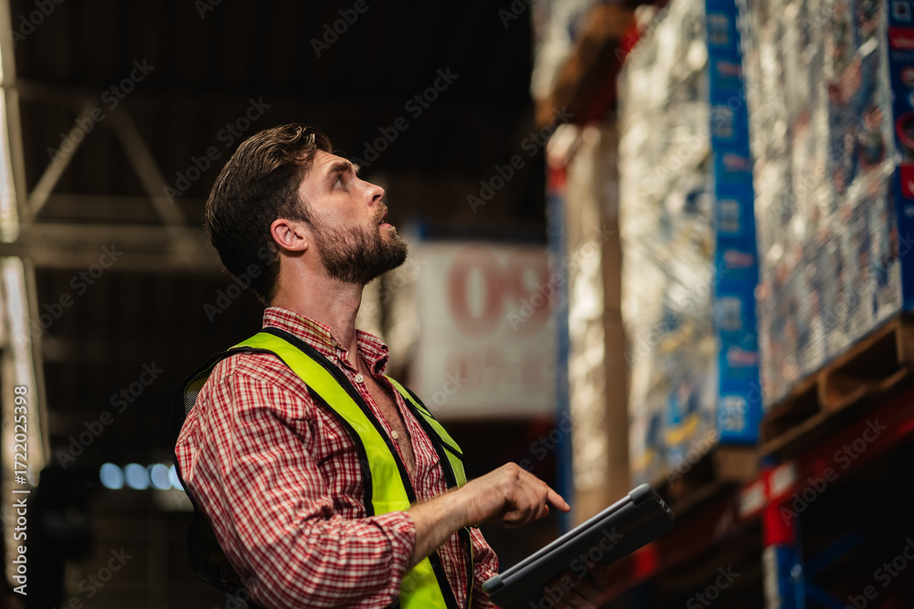 Warehouse workers and manager in reflective vests inspecting inventory, using digital tablet for stock control, logistics, supply chain management, and modern industrial warehouse operations.