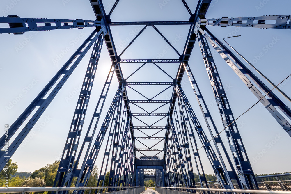 Bolts and nuts on metal plates of steel structure of heavy duty straight crossbar of frame and bridge support
