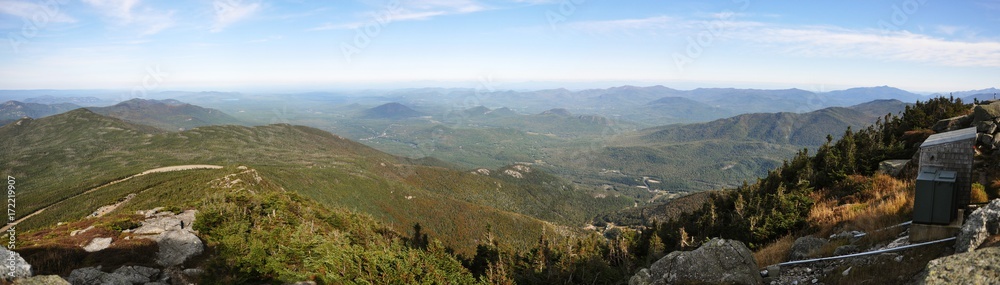 Adirondack Mountains panorama (East) view from top of Whiteface Mountain in fall, New York State, USA.