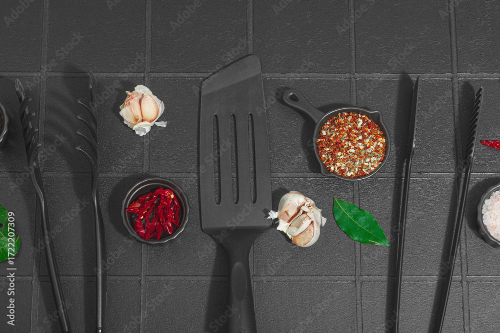 Barbecue season concept. Grill tongs, spatula, spices set, coarse salt, garlic and fresh herbs