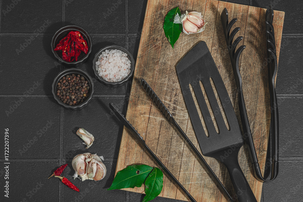 Barbecue season concept. Grill tongs, spatula, spices set, coarse salt, garlic and fresh herbs