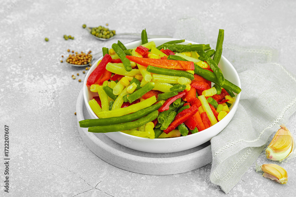 Vibrant frozen vegetable mix with yellow and green beans, red bell peppers, corn. Frosty texture