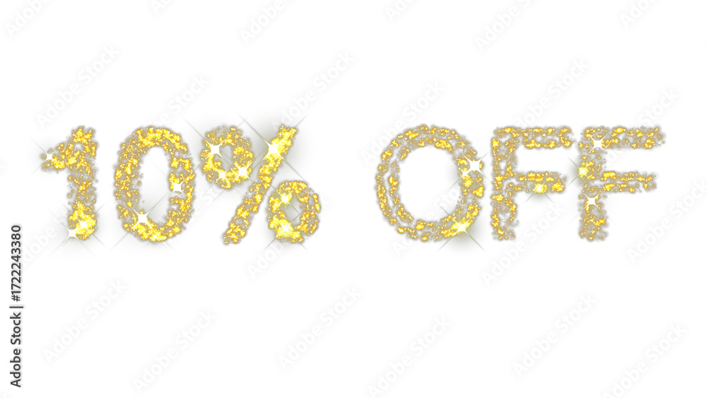 Sparkling text animation displaying 10% off promotion in shimmering gold effect for seasonal discount sale on transparent background